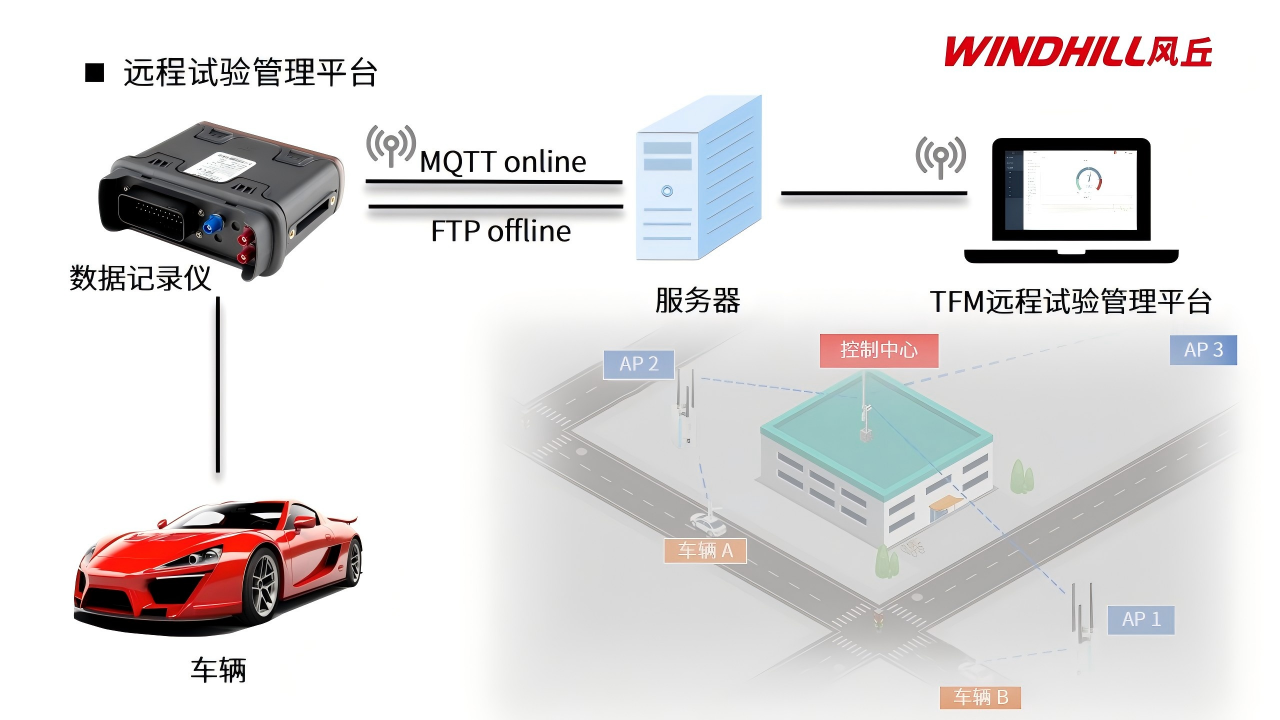 3.风丘科技的远程试验管理平台(TFM)适用于车辆远程试验实时监控。该系统简单易用,一键点击即可实现实时监控试验车辆位置、轨迹和状态,还可实现对多台试验车辆同时进行监控。通过MQTT可在线实时获取车辆信息,而通过FTP则可离线获取或上传试验数据。