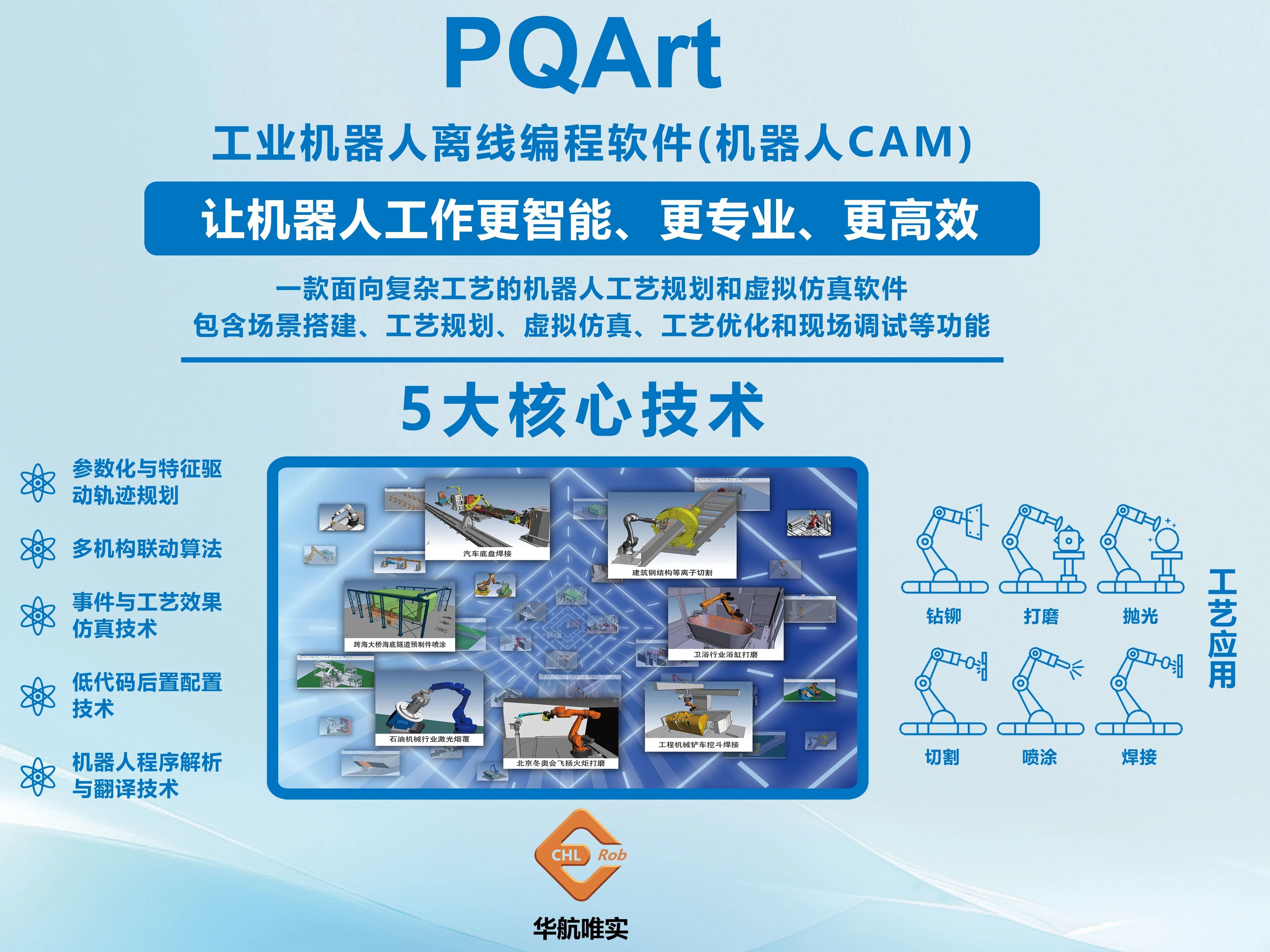 工业机器人离线编程软件(机器人CAM)让机器人工作更智能、更专业、更高效。一款面向复杂工艺的机器人工艺规划和虚拟仿真软件包含场景搭建、工艺规划、虚拟仿真、工艺优化和现场调试等功能。5大核心技术、参数化与特征驱动轨迹规划、多机构联动算法、事件与工艺绮效果仿真技术、低代码后置配置技术、机器人程序解析与翻译技术。
